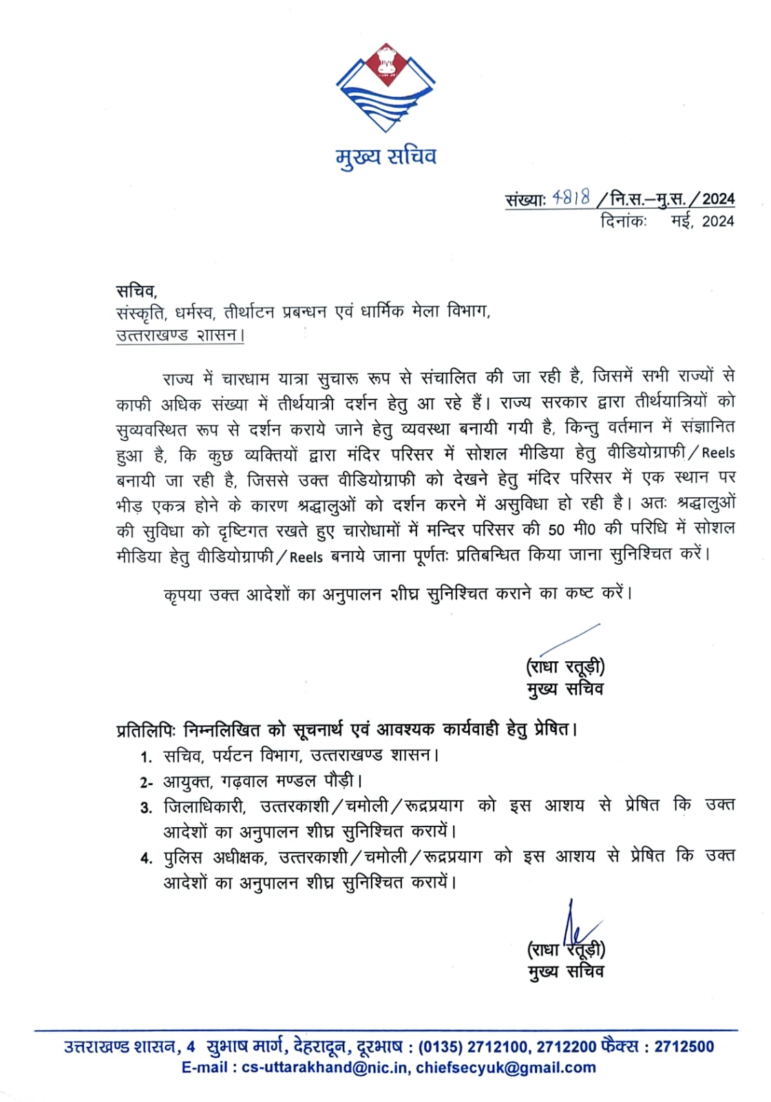 इसी के साथ उत्तराखंड की मुख्य सचिव राधा रतूड़ी ने चारों धामों में मंदिर परिसर के 50 मीटर के दायरे में वीडियोग्राफी/सोशल मीडिया के लिए रील बनाने पर प्रतिबंध लगाने का आदेश भी दिया। उन्होंने यह आदेश सचिव पर्यटन, आयुक्त गढ़वाल मंडल और संबंधित जिलों के डीएम और एसपी को दिया है।