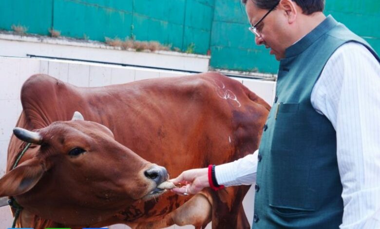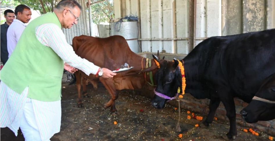 सीएम धामी व मंत्री गणेश जोशी ने गोवर्धन पूजा पर किया गौ माता का पूजन और सेवा