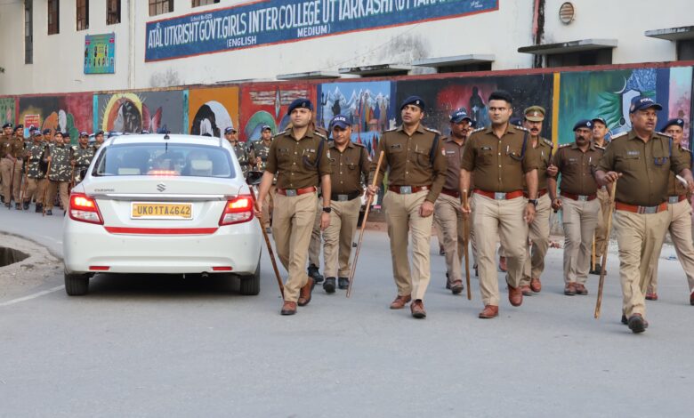 शांति व्यवस्था बनाने के लिए पुलिस ने उत्तरकाशी में निकाला फ्लैग मार्च