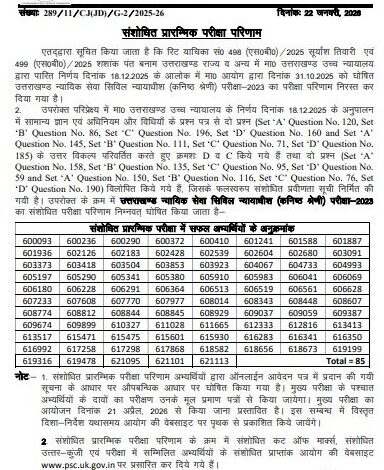 देहरादून। उत्तराखंड लोक सेवा आयोग ने उत्तराखण्ड न्यायिक सेवा सिविल न्यायाधीश (कनिष्ठ श्रेणी) परीक्षा-2023 का संशोधित प्रारम्भिक परीक्षा परिणाम घोषित कर दिया है।