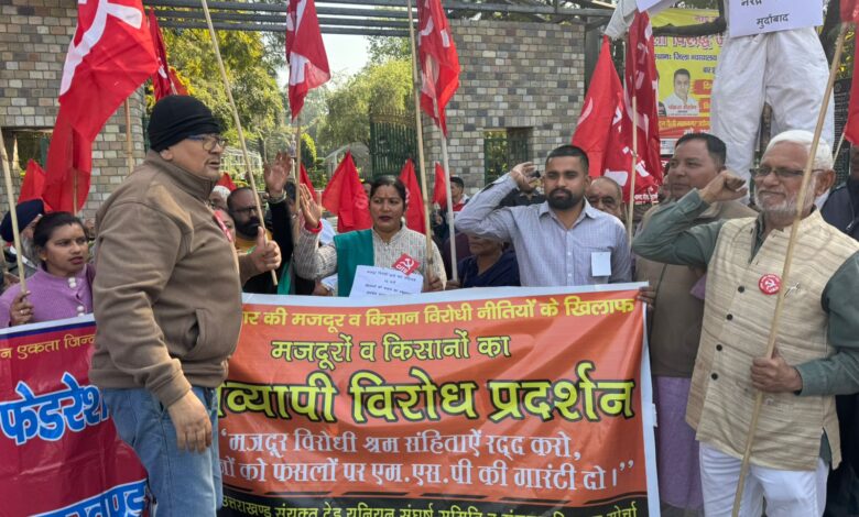 आज सीटू, ऐटक, इंटक उत्तराखण्ड किसान सभा ने संयुक्त रूप से प्रदर्शन किया इस अवसर पर सीटू व किसान सभा ने सीटू कार्यालय से जलूस के रूप मे गाँधीपार्क पहुंचे व वहाँ मौजूद ऐटक इंटक के साथ मिल कर विरोध नारेबाजी करते हुएब जन सभा कि इस अवर पर सीटू के प्रांतीय अध्यक्ष राजेंद्र सिंह नेगी, प्रांतीय सचिव लेखराज, इंटक के प्रांतीय महामंत्री पंकज क्षेत्रीय, जिलाध्यक्ष अनिल कुमार, ऐटक के प्रांतीय महामंत्री अशोक शर्मा, उपाध्यक्ष समर भंडारी उत्तराखण्ड किसान सभा के प्रांतीय अध्यक्ष सुरेन्द्र सिंह सजवाण, महामंत्री गंगाधर नौटियाल, सीटू के जिलाध्यक्ष अध्यक्ष एस. एस. नेगी बस्ती बचाओ आंदोलन के संयोजक अनंत आकाश,आल इण्डिया लॉयर्स यूनियन के प्रांतीय महामंत्री शम्भू प्रसाद मामगाई ने विचार व्यक्त किये इस अवसर पर वक्ताओ ने कहा कि नरेंद्र मोदी द्वारा 2020 में विपक्षी सांसदों कि गैर मौजूदगी मे 44श्रम कानूनो मे से 29 श्रम कानूनों के स्थान पर मजदूर विरोधी 4 श्रम सहिताये बनाई गयी जिसे केंद्र कि मोदी सरकार द्वारा 21 नवंबर 2025 को लागु कि गयी है। इन श्रम संहिताओं के लागू होने से मजदूरों के सारे अधिकार समाप्त हो जाएंगे और मजदूरों को गुलाम बनाने का ही प्रयास है वक्ताओ ने कहा कि वही किसनो को फ़सल कका न्यूनतम समर्थन मूल्य कि गारंटी के वायदे से सरकार पीछे हट रही है जिससे किसानों मे व्यापक विरोध है। इस अवसर पर चारों श्रम संहिताएं लागु करने के खिलाफ विरोध स्वरूप प्रधानमंत्री नरेंद्र मोदी का पुतला फूंका इस अवसर पर जबरदस्त नारेबाजी कि गयी।
